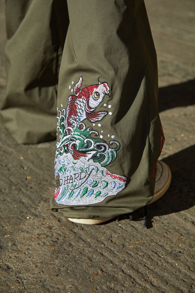 Cargohose im Utility-Stil von Ed Hardy. Ein exklusives Design im Archive-Stil. Das Modell wurde aus robuster Wolle gefertigt und verfügt über ein Logo und eine Tattoo-Grafik. Dehnbarer Bund mit verstellbarem Knebelverschluss sowie Seitentaschen, Taschen im Cargo-Stil und eng anliegende, verstellbare Bündchen. Nur bei UO erhältlich.