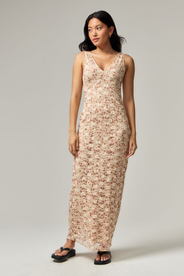 The most romantic maxi dress from Motel. Cut from a floral lace fabrication featuring a plunging V-neckline, slim-fitting silhouette and maxi hem.