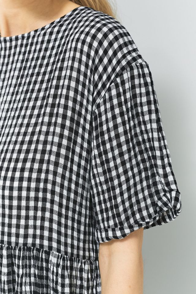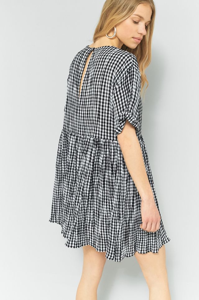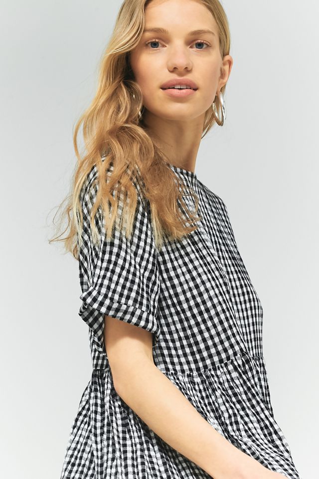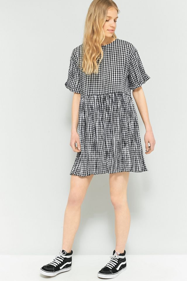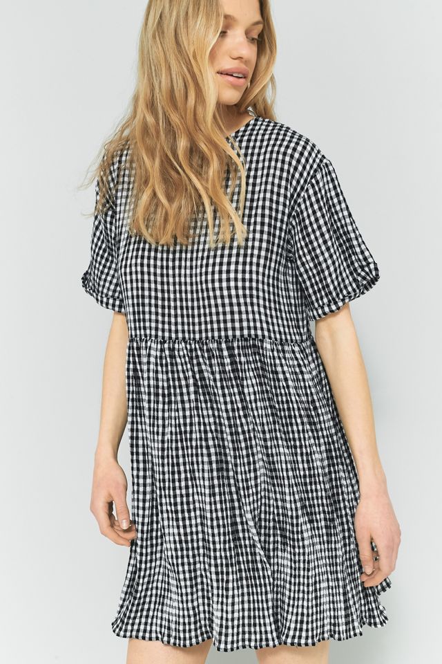 Mit diesem Kleid vom Urban Outfitters Exclusive Label Pins & Needles wirst du zu einem zuckersüßen Püppchen. Das Modell in lässiger und schwingender Babydoll-Silhouette verfügt über eine Empire-Taille, einen Rundhalsausschnitt und kurze Ärmel. Der Karoprint in unwiderstehlichem Retrostyle macht den Look perfekt.