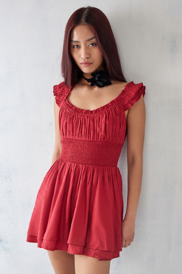 Schwebender Jersey-Playsuit mit gerafften Details und einem schmeichelhaften, gerafften Stretch-Panel an der Taille. Komplett mit einem Rundhalsausschnitt, kurzen Ärmeln und vollständig gerüschten Shorts.