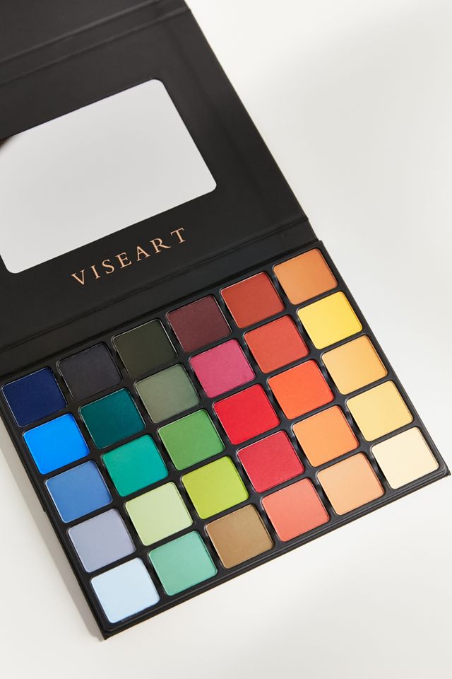 Professional palette by Viseart Paris featuring 30 ultra-pigmented primary colors in a convertible, folding easel design with a hard-shell sleeve, full-sized mirror and magnetized pans. Perfect for creating avant-garde and editorial looks that pop with bold expression.