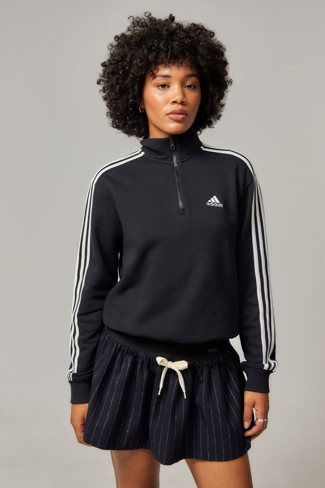 Staple quarter zip from OG sportswear brand, Adidas. Cut from a soft jersey with a funnel neck, zip-up placket, long sleeves and a slightly shrunken fit. Finished with the signature 3-stripe design and a logo badge to the chest.