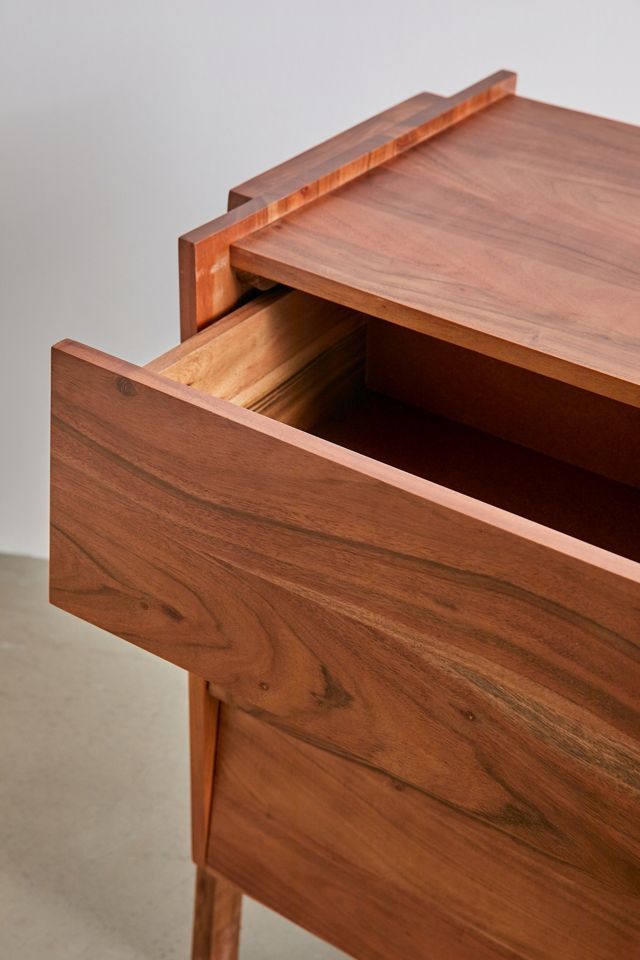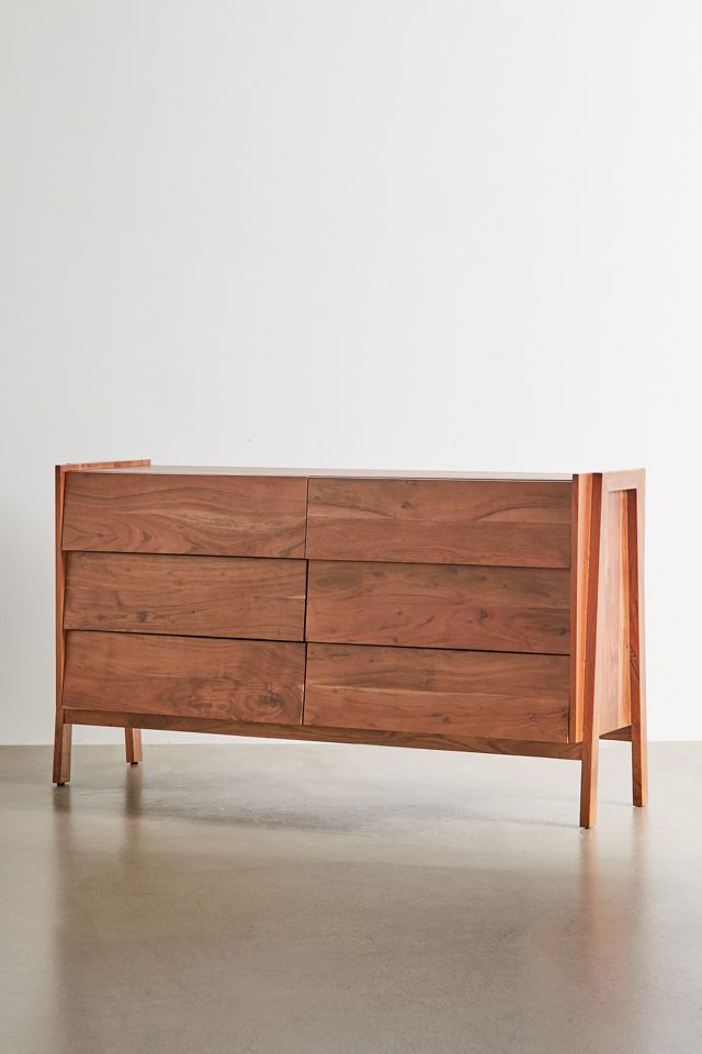 Acacia wood dresser from our Urban Outfitters-exclusive Akina collection, cut long with six drawers, featuring front panels set at an angle for easy pull with a minimalist-meets-rustic aesthetic. Featuring wooden dovetail drawer glides. Crafted from natural acacia wood with a live edge finish, the dresser you receive will vary in hue, tone and grain pattern from what’s pictured here. Two people recommended for assembly.