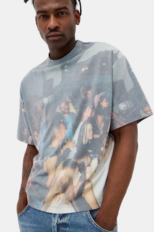 Vibrant graphic tee from BDG featuring a dynamic rave crowd print. Boxy silhouette cut from soft cotton with a classic crew neck, short sleeves, and a relaxed fit. Only at UO.