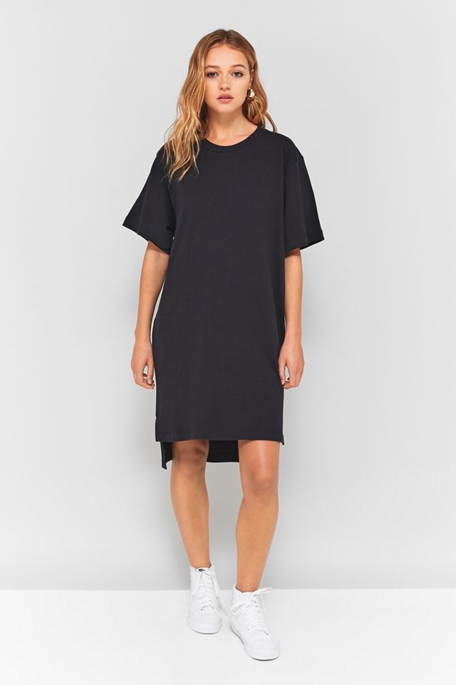 Minimalist-modern t-shirt dress from UO's own BDG label. Cut in an oversized construction and in a modern boxy shape. Topped with oversized short sleeves with dropped shoulders and with an a-line notched hem.