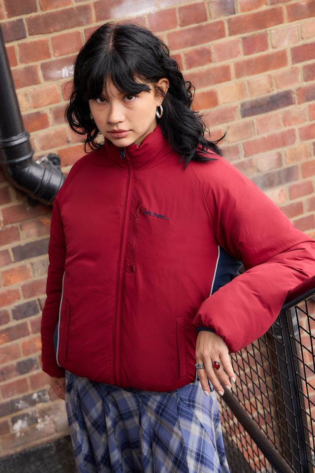 Get two-in-one style with this reversible puffer jacket from iets frans... Quilted and padded design complete with a hood, funnel neck, small chest logo, long sleeves, elasticated cuffs, a zip-through front fastening, side pockets and a drawstring hem. Only at UO.