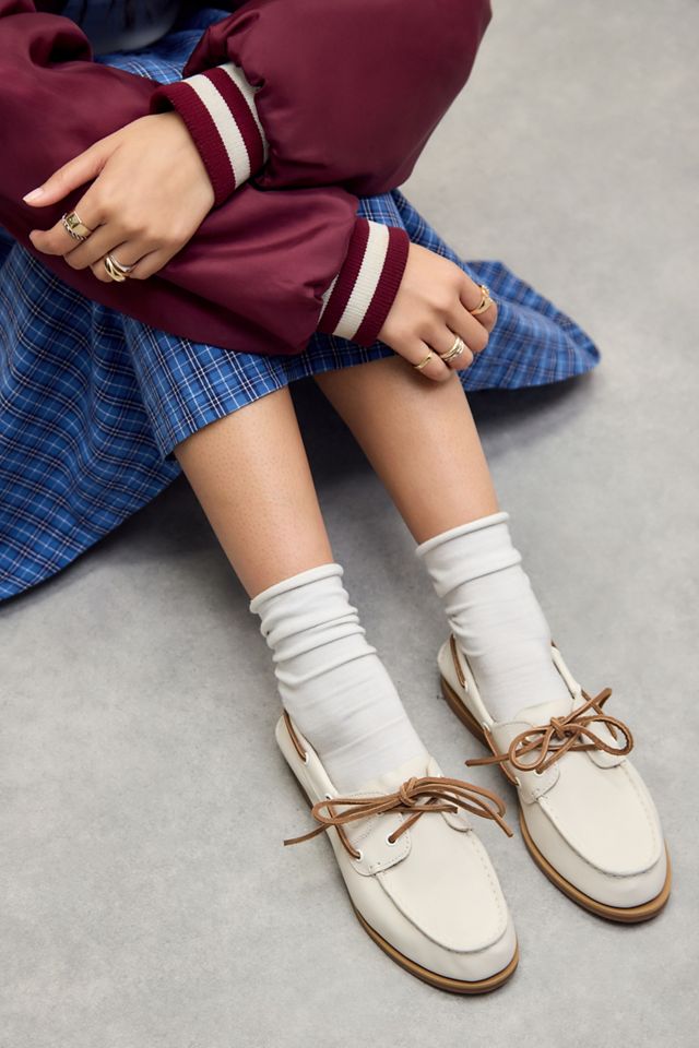 Classic and timeless boat shoes from Timberland. Crafted from premium suede and hand stitched, they include a 360° functional lacing system, signature logo to side, an almond toe and a cushioning rubber outsole.