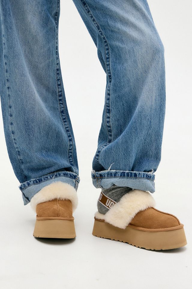 Make a statement with these Funkette slippers from UGG. An upgrade from the original Coquette slippers the Funkette are complete with a suede upper with the signature sheepskin lining, finished with a logo-topped webbing heel strap and platform rubber sole.