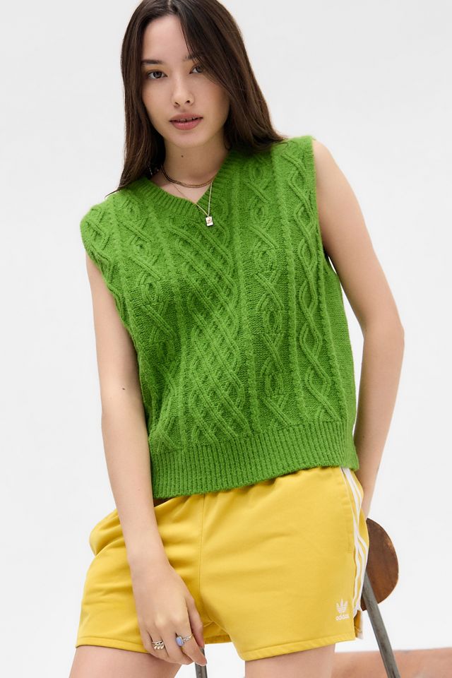 Layer up in this cute cable knit tank. Relaxed fit Ft. a V-neck and ribbed trims.