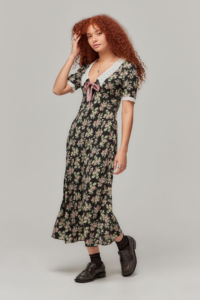 Vestido midi romántico de Kimchi Blue con un lindo estampado floral. Silueta entallada completa con un cuello de tela con ojales y puños a juego, cuello en V, mangas cortas y un bonito lazo en el frente. Solo en UO.