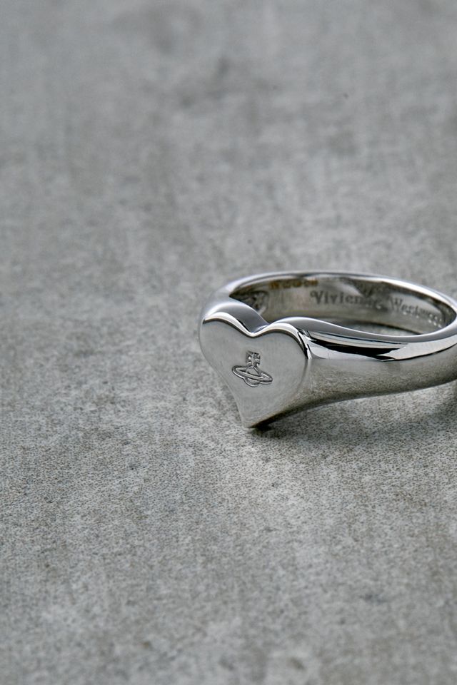 Anillo de plata de ley de Vivienne Westwood. Cuenta con una banda elegante con cara en forma de corazón y detalles de orbe grabados.