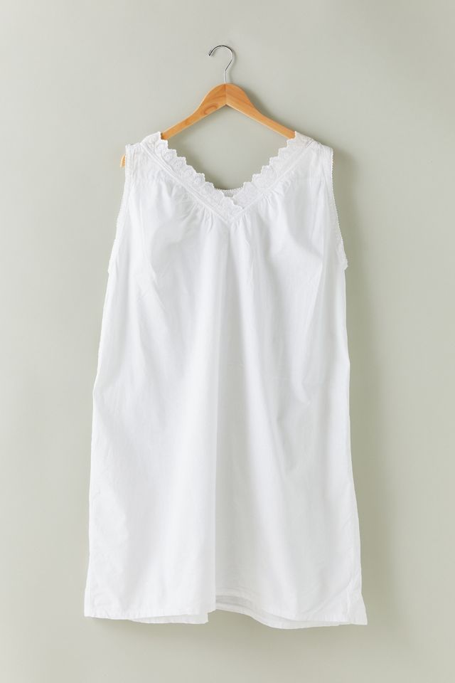 Robe légère présentée dans sa forme vintage originale. Silhouette sans manches décontractée avec encolure en v et garniture festonnée. Nous n'avons qu'un seul exemplaire.