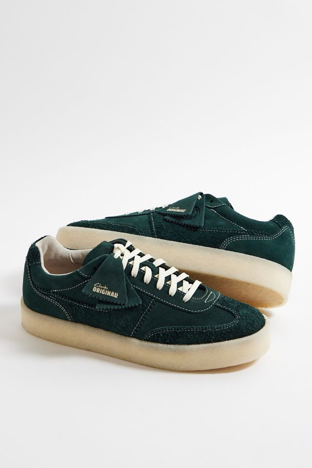 Scarpe Causal Tor 80 di Clarks, realizzate con una tomaia in camoscio verde pino liscio e vellutato al tatto. Profilo ispirato allo sport con chiusura frontale a lacci, punta tonda e suola in gomma naturale crepe. Rifinite con due ciondoli Clarks Originals.