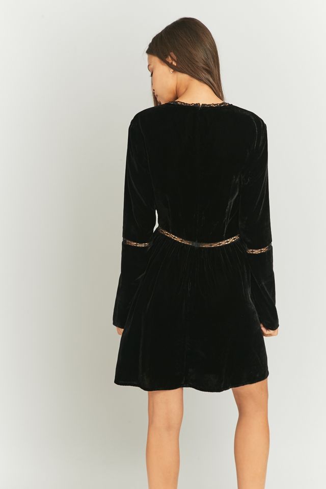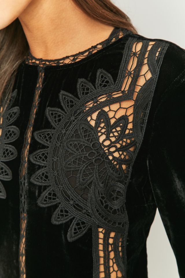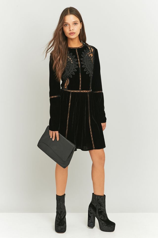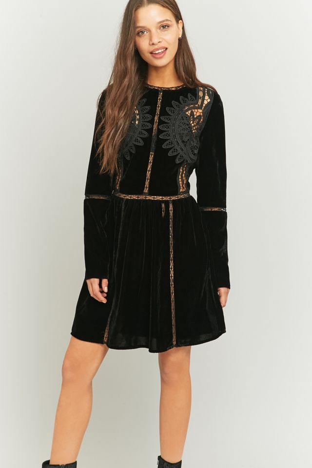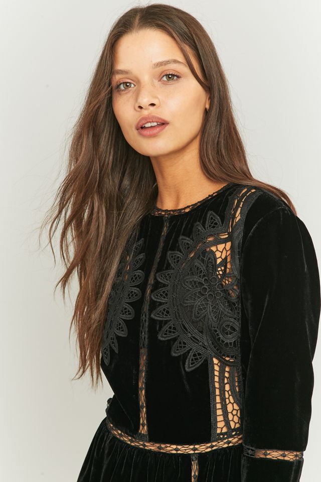 Il velluto Boho-femme e l'abito all'uncinetto sono offerti dall'etichetta Pins & Needles di UO. Velluto flessibile costruito in una costruzione a pannelli con dettagli a punto all'uncinetto trasparente in tutto. Presenta applique floreali sul petto. Sormontato da un alto girocollo e maniche lunghe a campana.