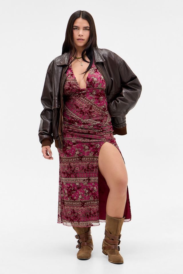 Elegante abito halter floreale esaltato da un dettaglio floccato. Siluetta aderente realizzata in tessuto a rete elasticizzato, con un profondo scollo, design senza maniche, schiena scoperta, chiusura con fiocco sul retro e spacco laterale. Solo da UO.