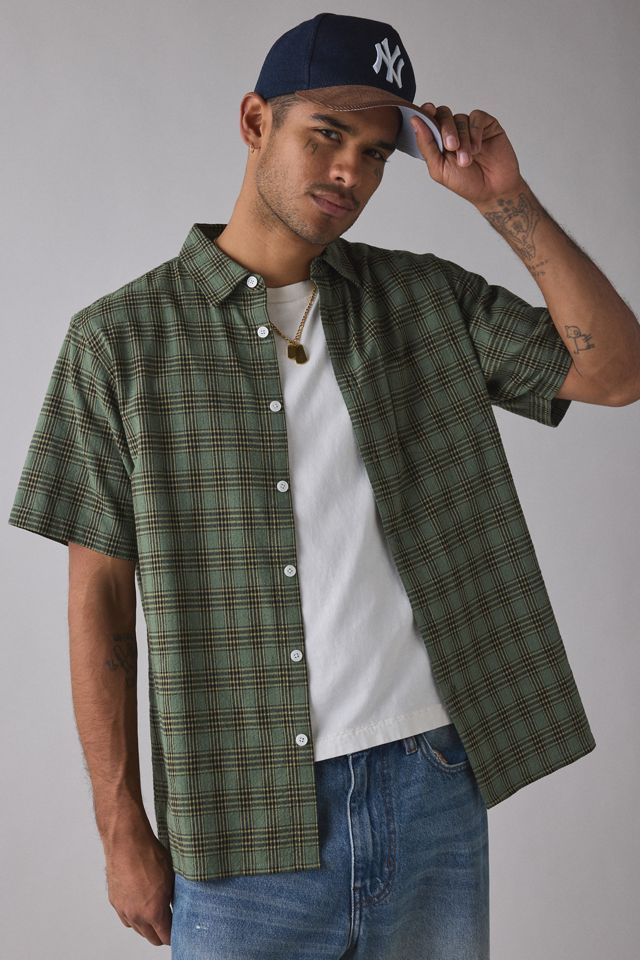 Short sleeve office-ready shirt by 925 Originals. Allover check pattern cotton shirt with a collar & button-down front. Versatile daily staple to wear layered or alone, paired with your favorite jeans and more.