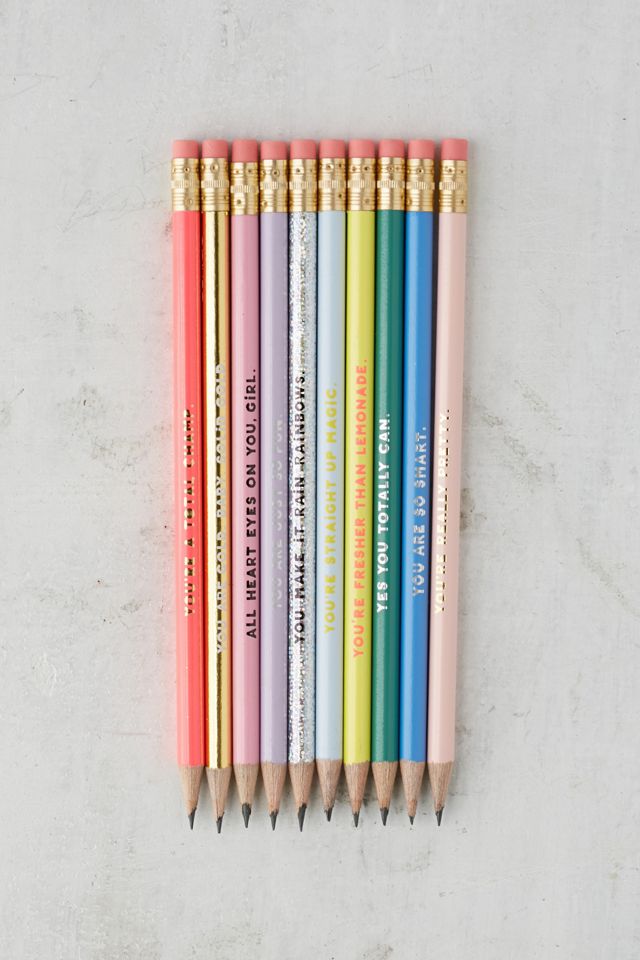 Set of 10 graphite pencils with the cutest compliments at the front. Wrapped in multi-colored casing and tipped with pink erasers - perfect for passing on to friends who need a little pick-me-up.