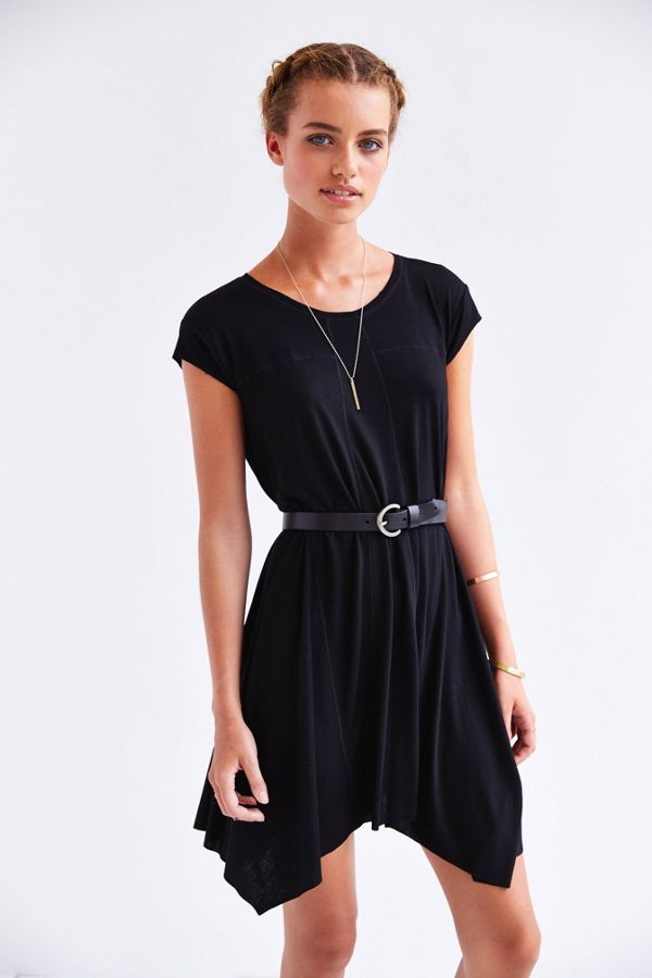 Soft + drapey knit tee dress with a raw-edge, cutoff hem from better-than-basic label, BDG. Cut in a swingy silhouette with allover seaming detail, a rounded neckline and short cap sleeves.