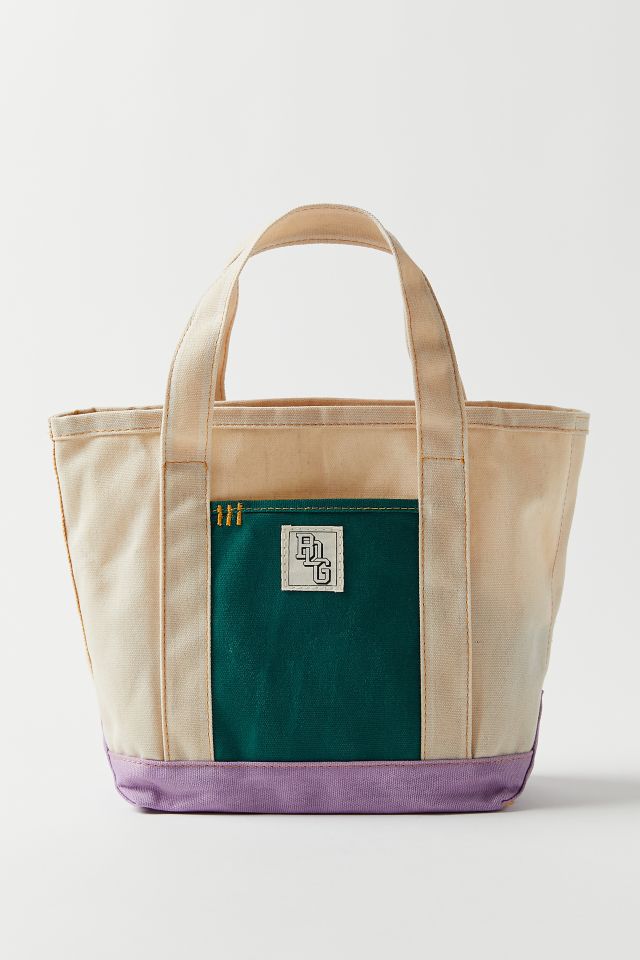 Cotton canvas tote bag reinforced with colorblock pieces and stamped with a BDG logo patch. Spacious slim interior, outside pocket and dual haul handles.
