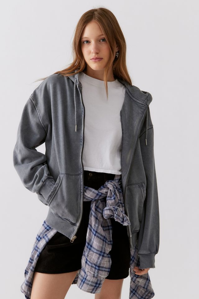Staple oversized hoodie from BDG. Zip-up hoodie style with a cozy hood at the back, dropped shoulders and a zip closure at the front. Washed soft and faded for that perfect vintage hoodie look and feel. Finished with side pockets. Only at UO.