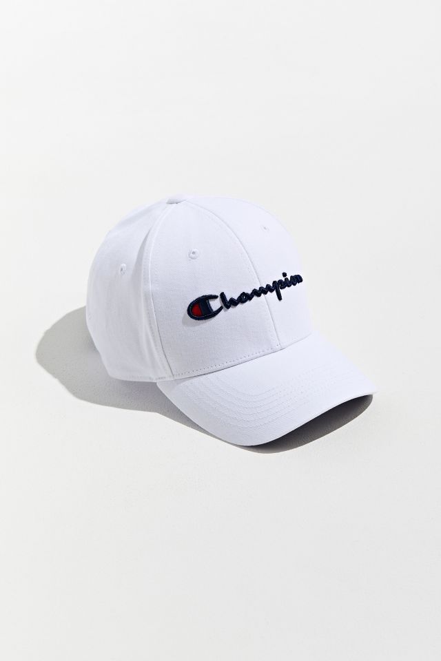 Essential Champion baseball cap featuring an embroidered logo at the front. Cotton twill six-panel is complete with a slightly curved brim, stitched grommets and an adjustable strapback closure. Champion has been offering its innovative athletic apparel for men and women since 1919.