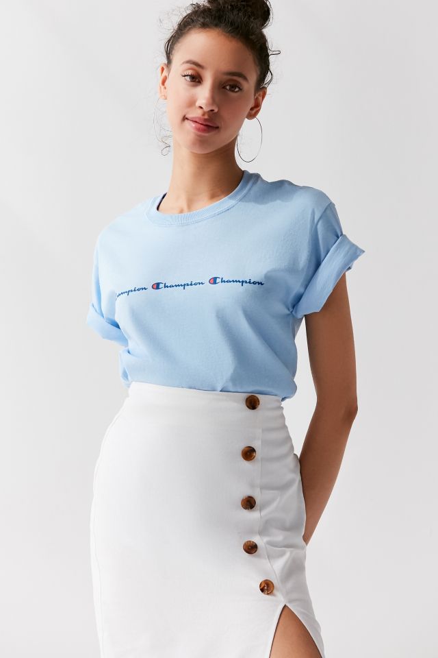 Classic logo tee from Champion, available only at UO. Made from a super soft knit in relaxed-fit, longline construction. Topped with a banded crew-neck + short sleeves. Finished with logo detailing at the chest.