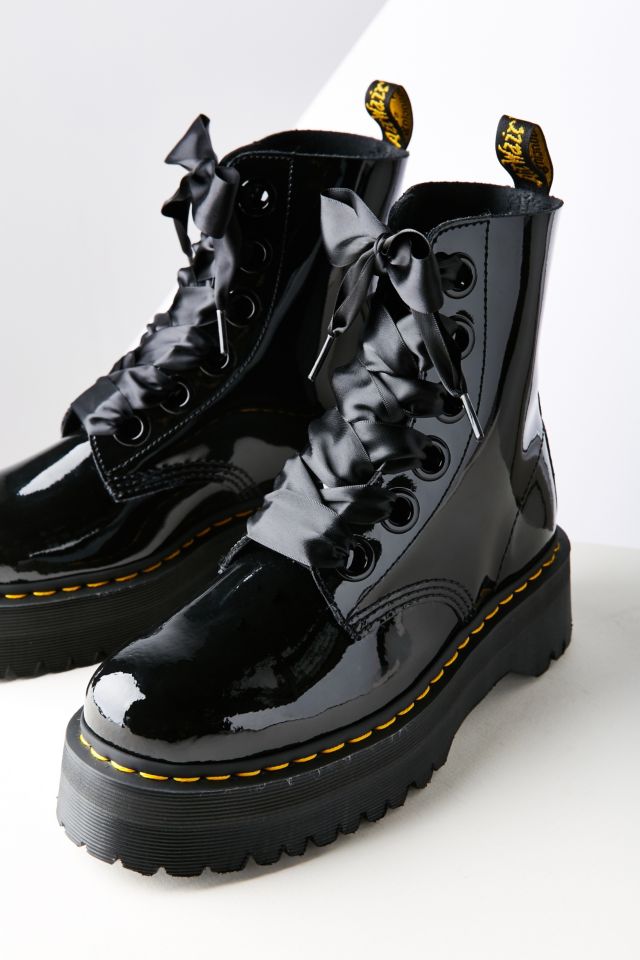 Take your style to toweringly bold heights with this patent leather platform boot from Dr. Martens. 6-eye lace-up silhouette in a polished patent leather with a high-shine finish accented by satin ribbon laces and the classic back pull tab. Finished with their signature air-cushioned midsole with an extra-thick slip-resistant platform rubber sole.