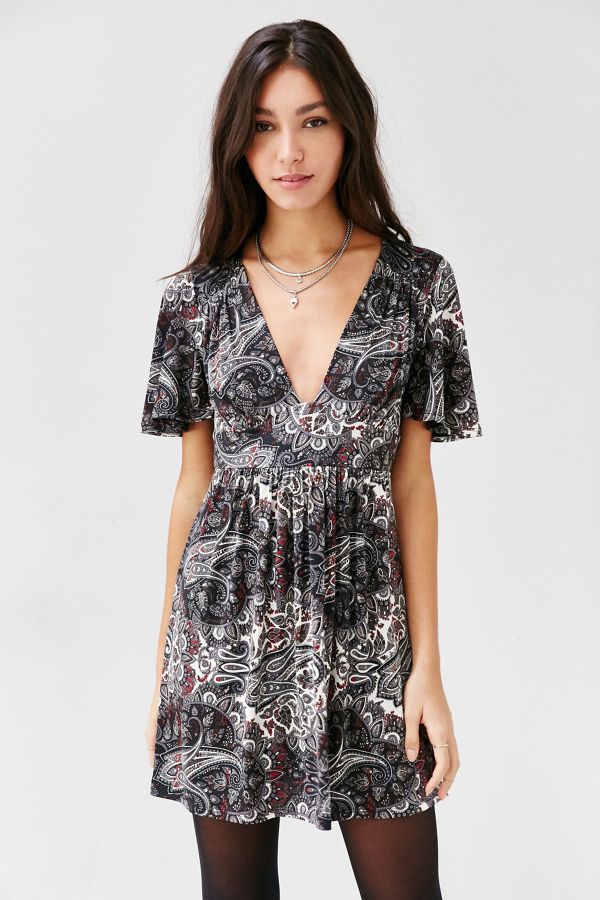 Printed empire-waist dress from the bohemian Ecote collection. Fitted at the bodice with a plunging neckline and trimmed with airy flutter sleeves. Finished with a keyhole opening at the back.
