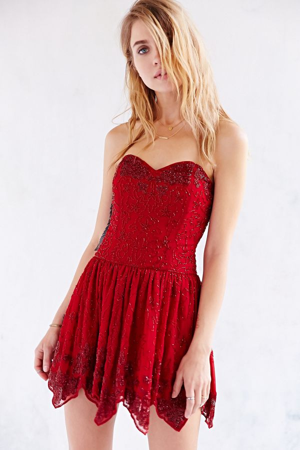 Embellished mini dress from boho brand Ecote. Strapless fitted bodice with allover embellished details complete with a swingy scallope-edge skirt and a zippered closure.