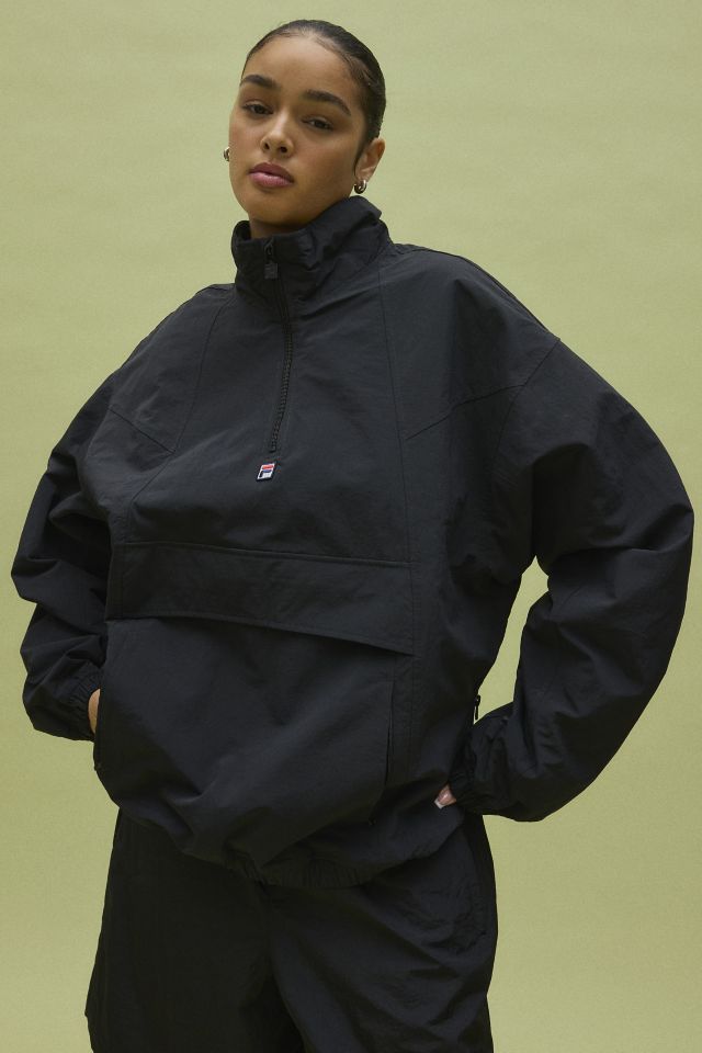 Elevated FILA X HAILEY pullover jacket blends Hailey’s signature style with functional details. Designed in a boxy silhouette with a high stand collar, drop-shoulder long sleeves and front kanga pocket giving you the perfect transitional layer from errands to evening plans. Finished with zip-slit hems and a FILA F-Box logo detail.