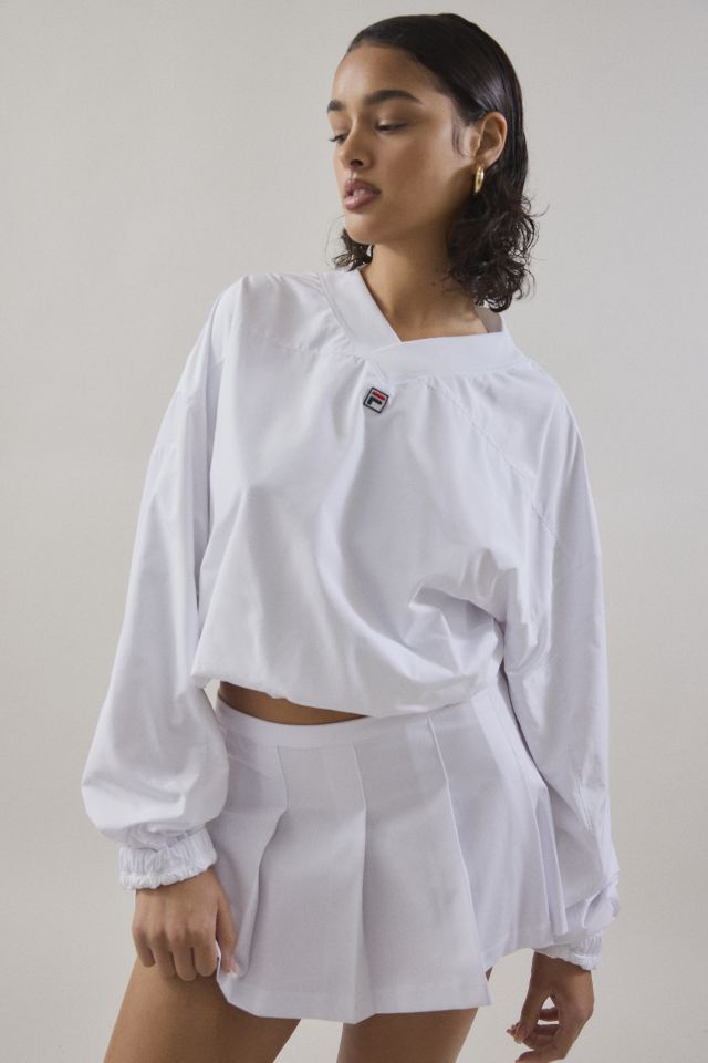 ’90s-inspired FILA X HAILEY windbreaker in an easy pullover style. Designed with a ribbed knit v-neckline, long sleeves with elasticated cuffs and a cinched, elasticated hem to be your new go-to for easygoing style. Finished with a FILA F-Box logo at the chest.