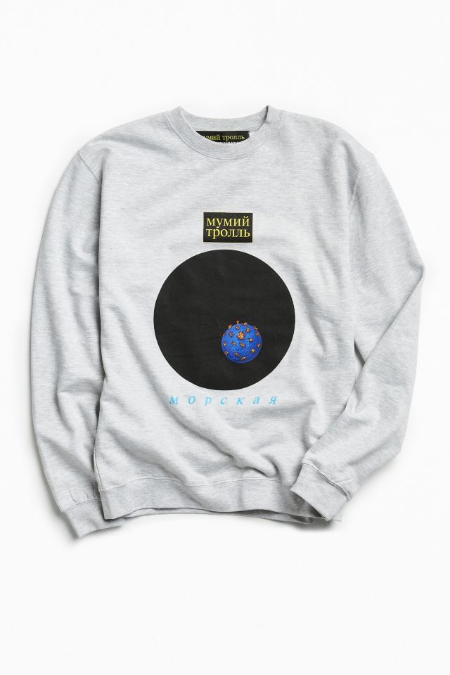 Gosha Rubchinskiy sweatshirt from the Mumiy Troll capsule collection with Ilya Lagutenko, featuring cover art from Mumiy Troll’s debut album Morskaya at the front with the track listings at the back. Cotton fleece is cut in a standard fit complete with ribbed banding at the crew neck, cuffs + hem.