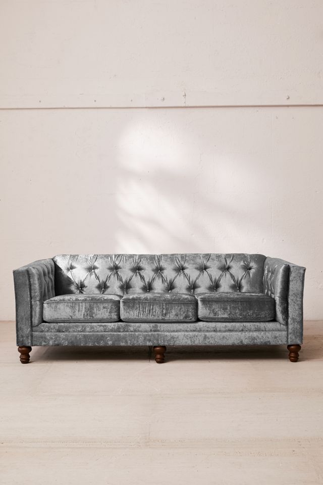 Vintage-inspired sofa in soft-sheen, dimensional crushed velvet for a retro-luxe piece for any living space. Features a tufted back, intricately carved espresso stained knob legs + 3 removable seat cushions for an extra cozy finish. This custom furniture piece will be made to order just for you.