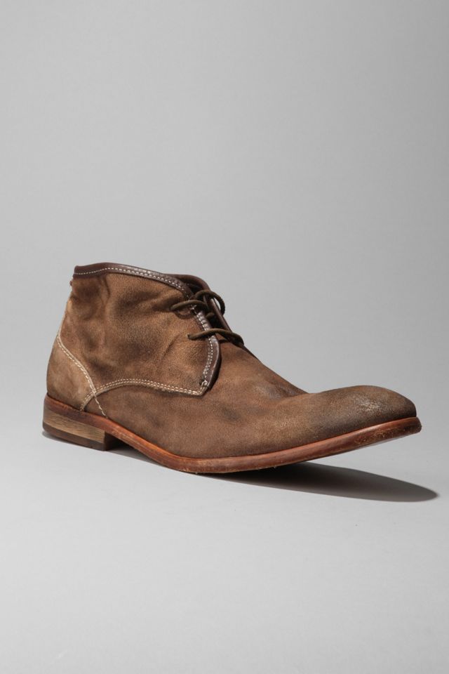 Rugged chukka boot from Italian-trained and London-based footwear visionaries H By Hudson. Rich distressed suede uppers with tonal leather trim; corded leather laces; cushioned footbed; block heel with rubber strike; leather sole.