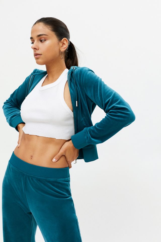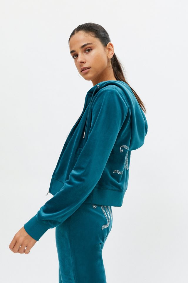 A velour jacket with early 2000s vibes from Juicy Couture. Slim fit. Cropped to the waist. Complete with a cozy hood and a diamante logo at the back.