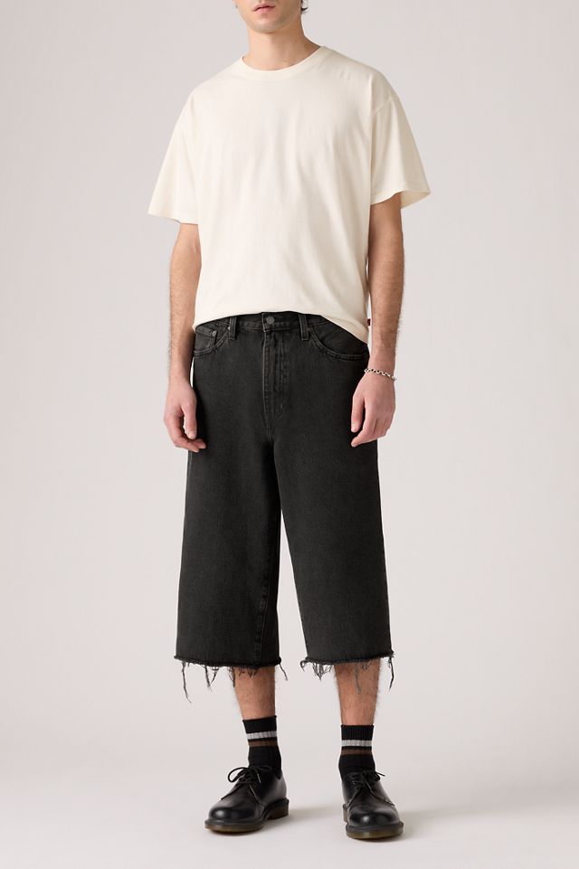 Baggy fit denim capris from Levi's®. Longline jorts with a raw cut hem. Classic mid rise waist with a zip fly and button closure. Updated everyday style ready to pair with athletic jerseys and button-down shirts.