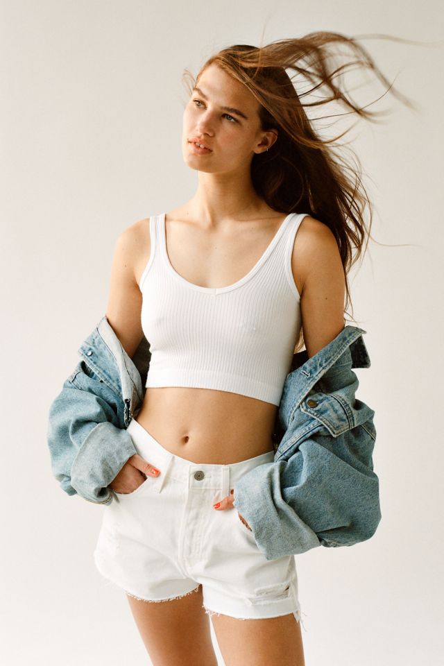 Jean shorts from Levi’s® with a frayed, cutoff hem. Made with a slim, curve-skimming fit and a high-rise. Signature Levi’s® detailing at the back.