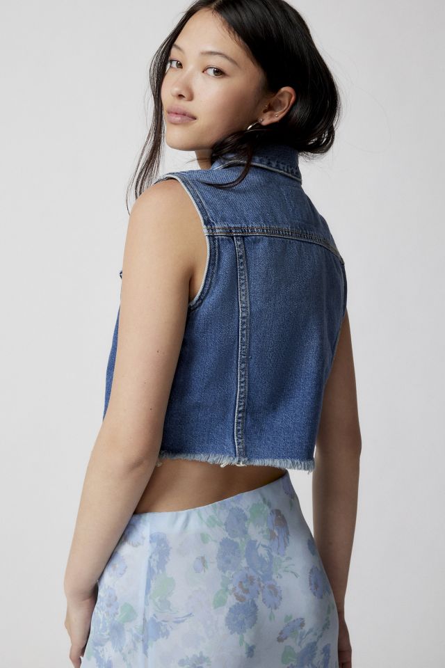 Shrunken denim vest from Levi’s® crafted from their signature rigid denim. Cropped above the waist and cut in a slim-fit with a pointed collar and a button placket at the front. Finished with a raw cutoff hem.