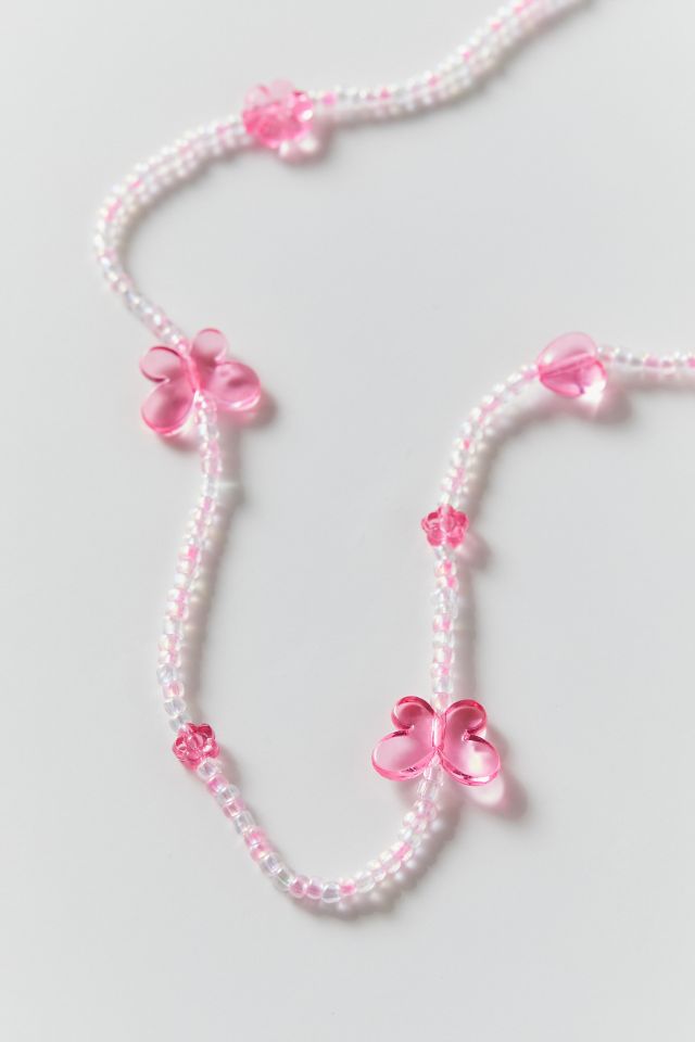 Beaded necklace strung with bright butterfly charms and bauble beads. Complete with a metal clasp closure and extender chain.