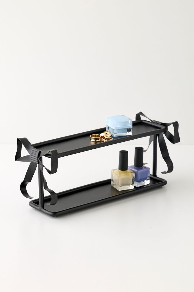 Keep your beauty space tidy with this metal storage shelf and organizer featuring a duo of tiers accented with crinkled bows at each end. Available exclusively at Urban Outfitters.