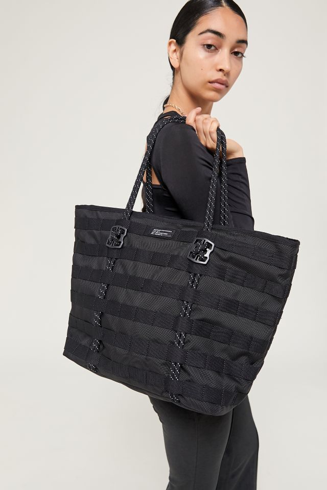 Function and fashion merge in this tough tote bag by Nike, featuring a spacious compartment and cord handles.