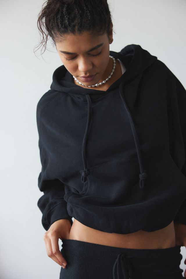 Updated Out From Under pullover hoodie in a boxy & cropped fit. Cropped hoodie in a super-soft brushed lightweight knit featuring a crew neckline with hood & string details, front kanga pockets and a cinched bubble hem designed to be an elevated everyday basic. Exclusively at Urban Outfitters.