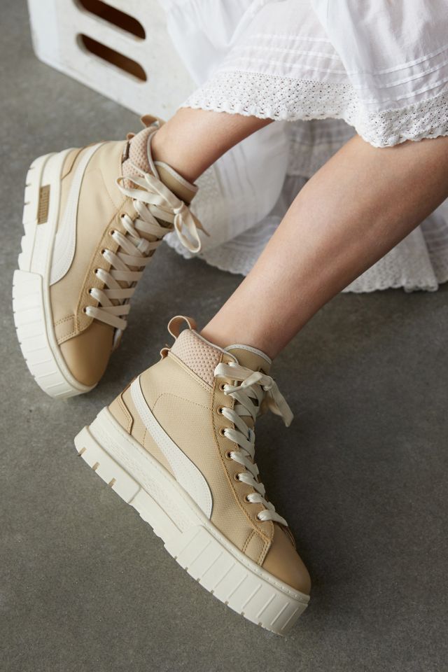 Big and bold with an elevated sole, tons of texture, the Puma Mayze Mid draws inspiration from basketball culture and sport fashion. Mid-boot silhouette is made of leather with suede overlays, featuring an elevated midsole with textured tooling.