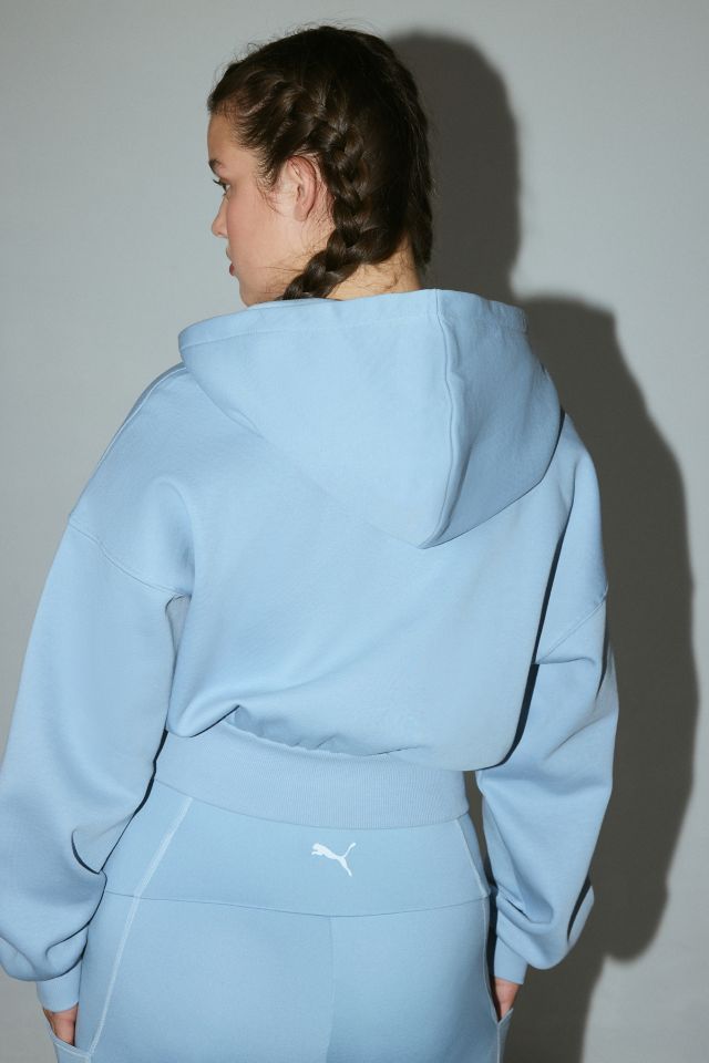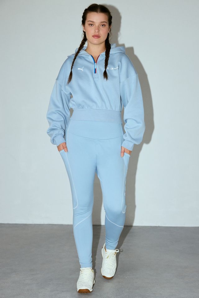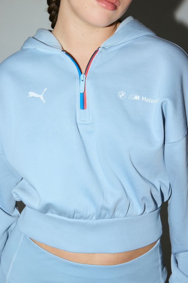 Sporty Puma X BMW M Motorsport hoodie sweatshirt in a boxy & cropped silhouette. Features a hooded neckline, drop shoulder long sleeves and a half-zip down the front. Topped with puma & BMW M motorsport graphics at the chest.