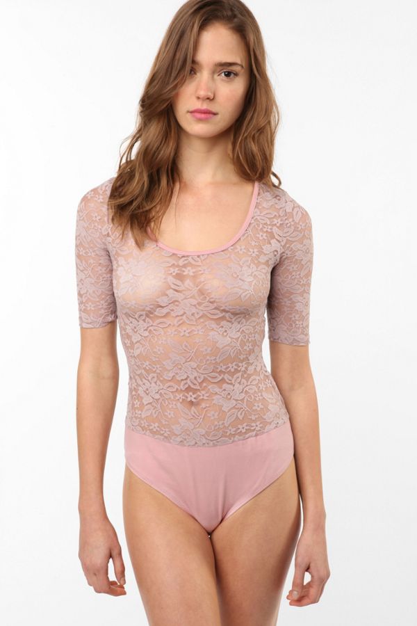 Romantic rosey lace bodysuit perfect for layering, with short sleeves and wide neckline. Cut in a slim, body-hugging silhouette with snap closure at the crotch. Made in the USA. Hand wash.