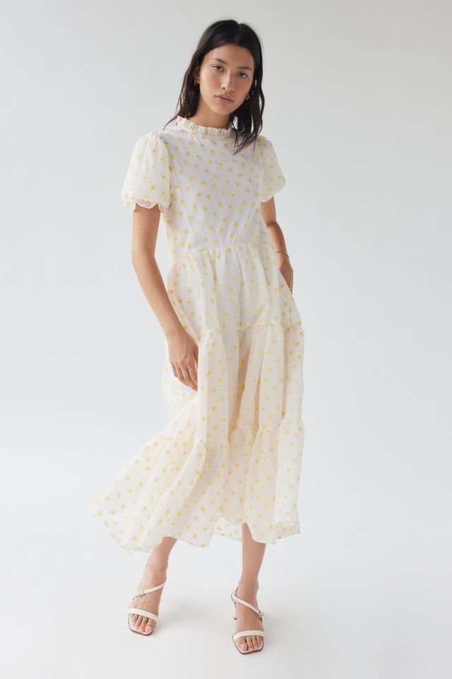 Midi dress from Sister Jane with multi-color floral motifs allover. Ruffled neckline with puffy short sleeves, a slim fitting bodice and a flowy tiered midi skirt. Finished with a zip closure at the back.