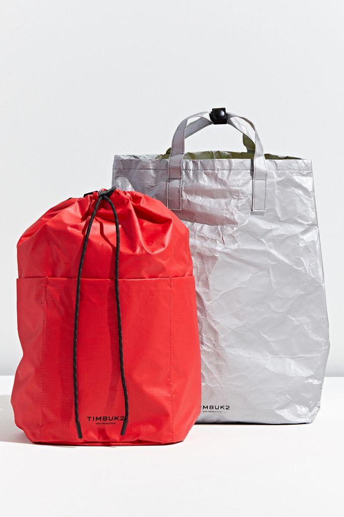 Wear it three ways! Exterior tote coupled with an interior drawcord backpack from Timbuk2, constructed from their ultra-light, wipeable material. Paper Bag Tote honors and upgrades the brown bag via a clever convertible pattern that can be carried as a tote, worn on your back, or separated into two distinct bags. Complete with easy to use reflective drawcord, three slash pockets accommodating water bottles and standard U-lock. Finished with printed reflective logo on both tote + backpack. Part of Timbuk2's Brown Bag series designed in collaboration with NYC artist Dave Ortiz, the Paper Bag Tote is a long-lasting take on the egalitarian brown bag. Wear it and channel your inner Dave Ortiz; never don't stop.