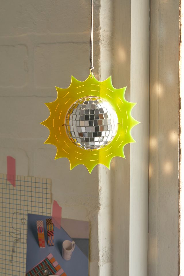 Make your groovy displays burst with whimsy with this hanging disco ball by Tiny Deer Studio featuring a colorful acrylic sunburst-shaped frame. Equipped with a stretch loop attachment for easy setup.