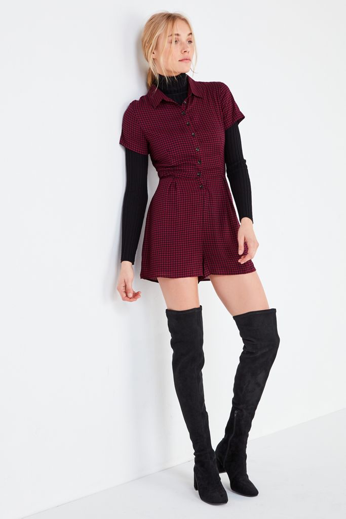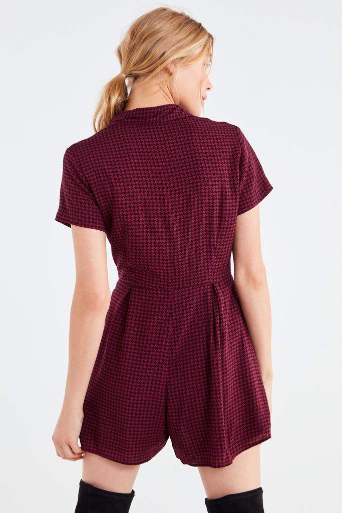 Forever ‘90s in this button-down romper that’s made from a geometric ditsy print fabrication. Curve-skimming fit topped with a pointed collar + short sleeves. Finished with a relaxed-fit, high-rise shorts bottom that features pleated detailing.