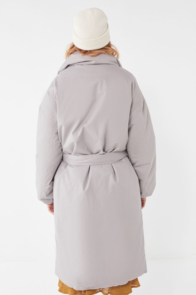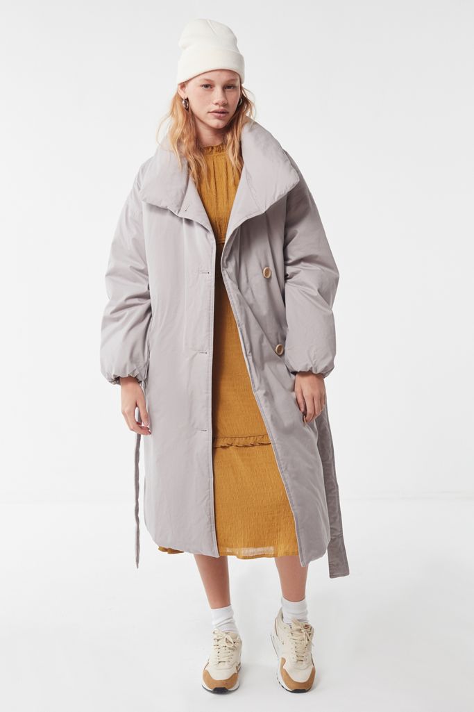 Puffer jacket turned trench coat from Urban Outfitters in an oversized midi-length silhouette with a self-tie belt at the waist. Finished with a pointed collar, pockets at the waist and elastic banded cuffs. Exclusively at UO.
